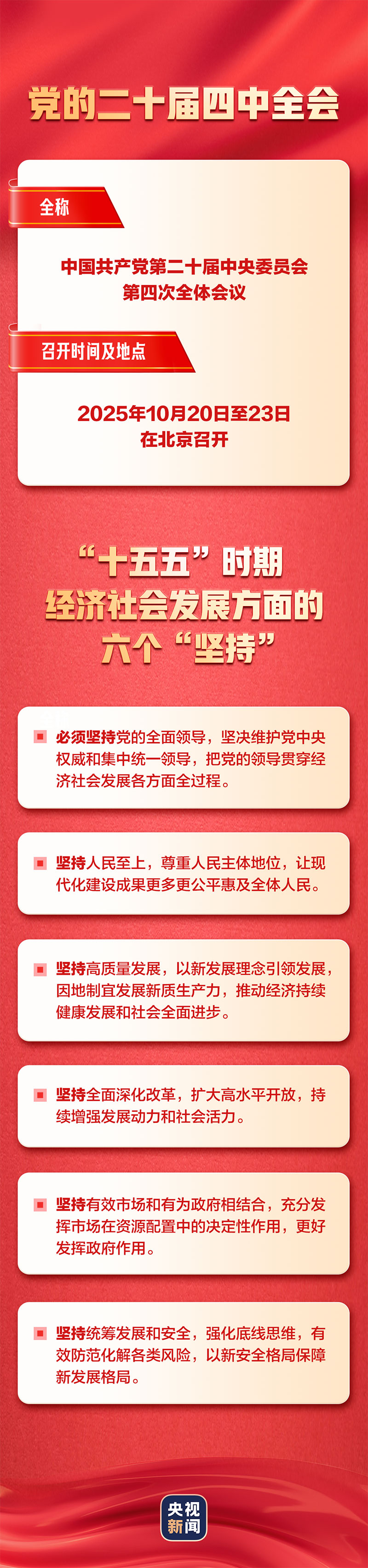 中国共产党第二十届中央委员会第四次全体会议于2025年10月20日至23日在北京召开。带你一张图了解党的二十届四中全会。