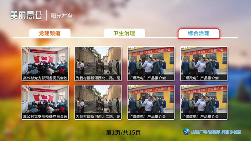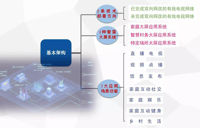 主要包括贴近村民生活的智慧应用场景。通过大屏端,村民在家中能实现电视直播、视频点播、信息发布、家庭互动社交、家庭娱乐、家庭互动健身、乡村生活七大应用场景功能。