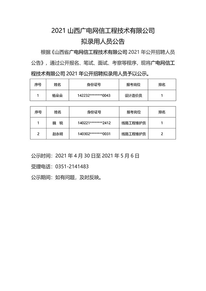 2021山西广电网信工程技术有限公司 拟录用人员公告